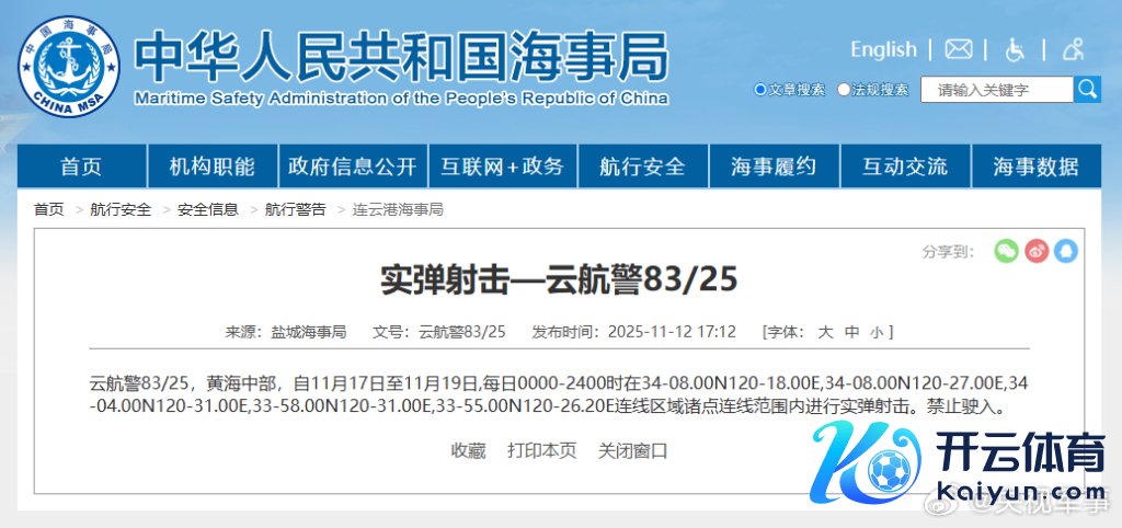 据中国海事局网站音书,盐城海事局发布飞翔告戒,11月17日至19日,逐日0时到24时,黄海中部部分海域进行实弹射击,辞谢驶入。