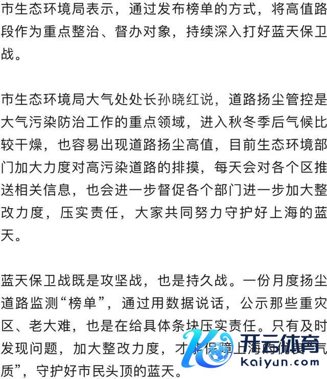 记者从上海市生态环境局获悉,现在,一套智能化、精确化的说念路扬尘在线监测系统已障翳上海全市,系统每个月会生成一张扬尘说念路监测“收成单”,让扬尘耻辱最严重的区域上榜公示。